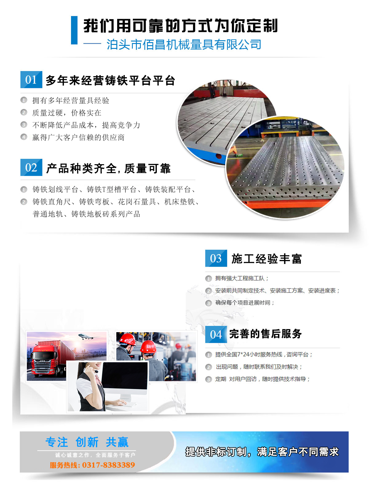 泊頭市佰昌機械量具有限公司坐落在有“鑄造之鄉(xiāng)”美稱的泊頭市,我公司自創(chuàng)建初期堅持誠信原則和不斷創(chuàng)新的原則,_為廣大用戶提供鑄鐵平板鑄鐵地板劃線平臺等放心產(chǎn)品,我們的產(chǎn)品_程度高,得到了廣大用戶的高度認可。